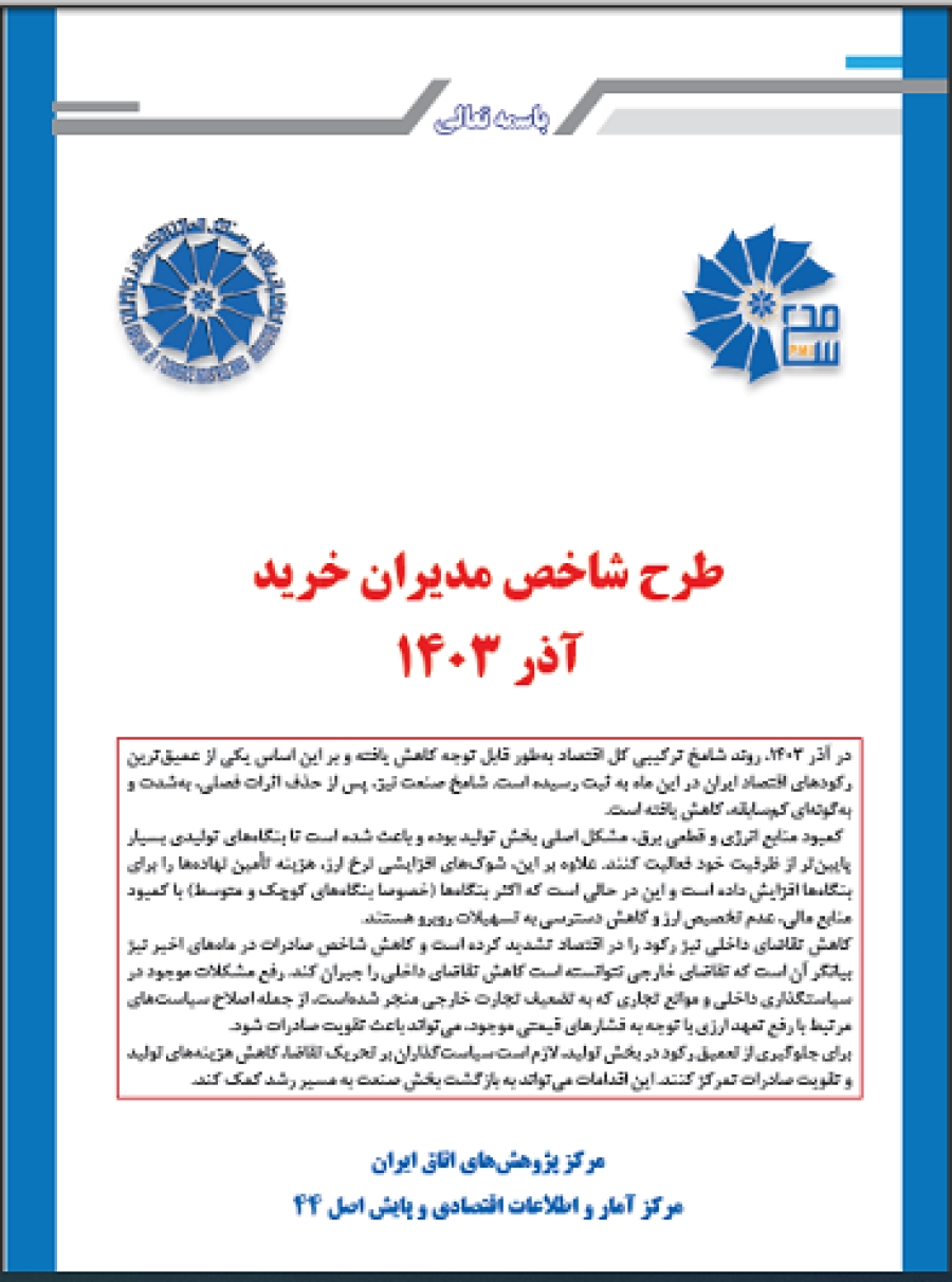 در آذر 1403، روند شامخ ترکیبی کل اقتصاد بهطور قابل توجه کاهش یافته و بر این اساس یکی از عمیقترین رکودهای اقتصاد ایران در این ماه به ثبت رسیده است. شامخ صنعت نیز، پس از حذف اثرات فصلی، بهشدت و بهگونهای کمسابقه، کاهش یافته است.