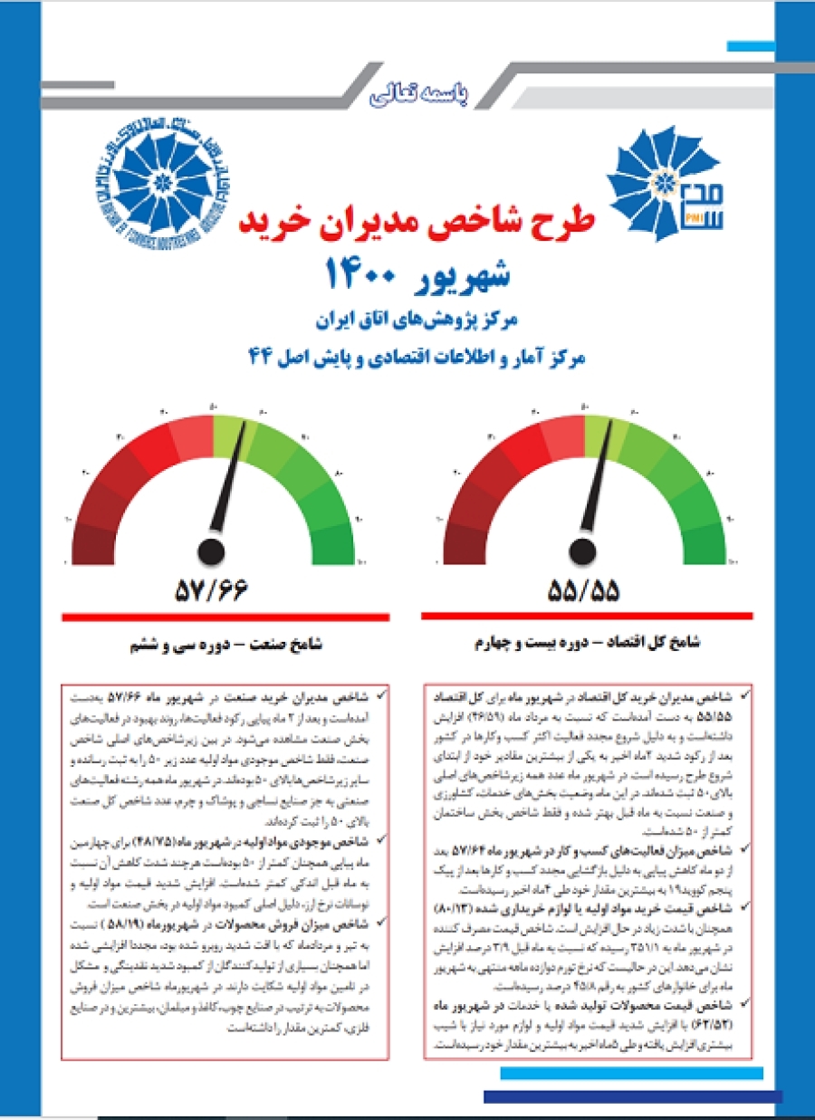  شاخص مدیران خرید کل اقتصاد در شهریور ماه برای کل اقتصاد ۵۵.۵۵ به دست آمده‌است که نسبت به مرداد ماه (۴۶.۵۹) افزایش داشته‌است و به دلیل شروع مجدد فعالیت اکثر کسب وکارها در کشور بعد از رکود شدید ۲ماه اخیر به یکی از بیشترین مقادیر خود از ابتدای شروع طرح رسیده است. در شهریور ماه عدد همه زیرشاخص‌های اصلی بالای۵۰ ثبت شده‌اند. در این ماه، وضعیت بخش های خدمات، کشاورزی و صنعت نسبت به ماه قبل بهتر شده و فقط شاخص بخش ساختمان کمتر از 50 شده‌است.